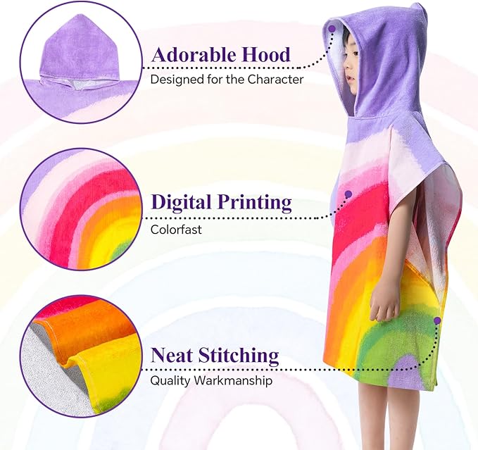- Super Soft Rainbow Poncho - The poncho is made from 100% high-quality cotton, it is significantly more comfortable to wear compared to polyester alternatives. The natural cotton fibers are softer and more breathable, providing superior comfort and better protection for your kid’s skin.