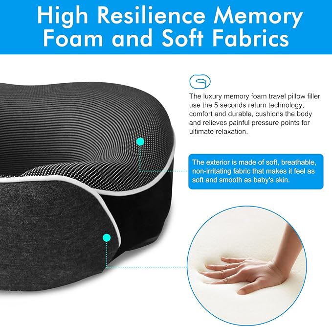 - 100% Pure Memory Foam Flight Pillow: We use the latest filler technology and high rebound 100% pure memory foam without additives. The luxury memory foam travel pillow filler use the 5 seconds return technology, comfort and durable, cushions the body and relieves painful pressure points for ultimate relaxation.