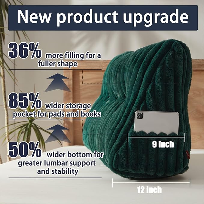 - [Thicker bottom and wider storage bag] This improved headboard pillow has increased the bottom depth by 50% and the pocket width by 85%. The thick bottom provides sufficient lumbar support and stability, and the greatly widened storage bag allows you to store large-sized pads and books, which is unique.