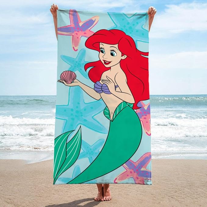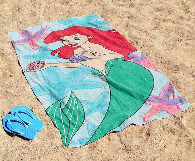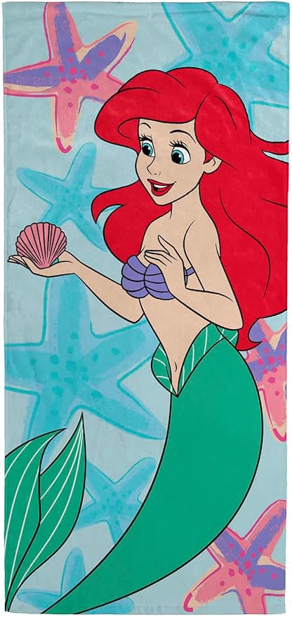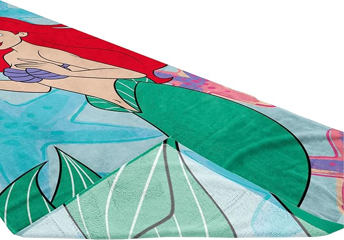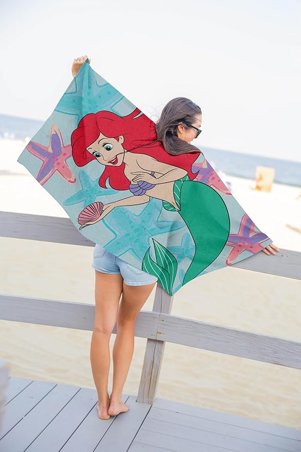 - SUPER SOFT & ABSORBENT - Little Mermaid beach towel measures 28 x 58 inches and features Princess Ariel. This towel is made from 100% cotton terry ensuring softness and comfort. Breathable fabric allows for absorbency while also being cozy to touch.