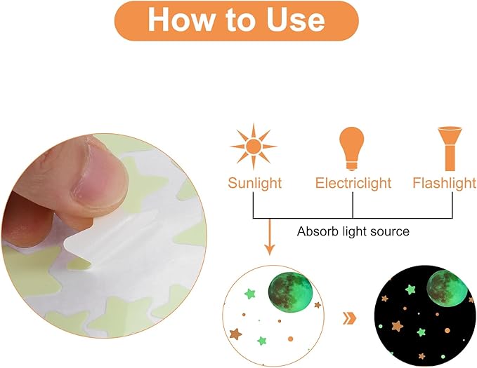 - [Easy to Use] - These self-adhesive decals can be easily pasted on clean and smooth ceilings and walls, just peel them off the paper and stick them on the wall, you can see the light emitted by these glowing stickers at night