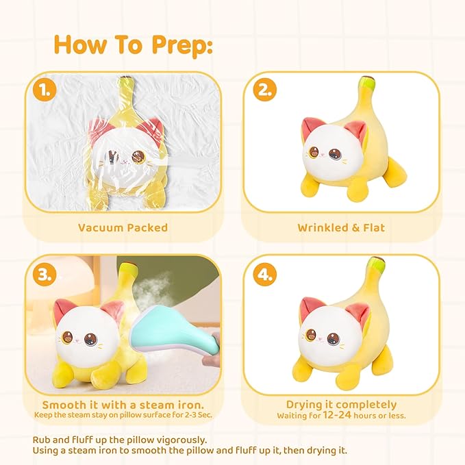 - VACUUM PACKAGEING: Please rub and fluff up the banana pillow vigorously. Using a steam iron to smooth the pillow and fluff up it, then drying it out. The plush will be restore better to keep the steam on the sruface of the pillow for 2-3 seconds.