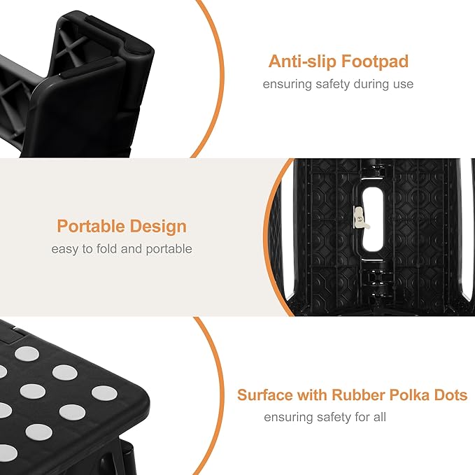 - Safety Design: Our foldable step stool for adults is equipped with a non-slip top and rubber bottom to prevent slips. Plus, this one step stool has a safety lock buckle to avoid accidental folding. With smooth rounded corners, the fold up stool keeps children safe from bumps.