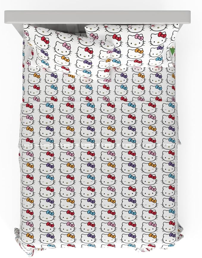 - HELLO KITTY DESIGN: Delight in the charm of Hello Kitty with this playful sheet set. Adorned with various colorful Hello Kitty faces, this set brings fun and whimsy to any child's bedroom, making bedtime a joyous occasion.