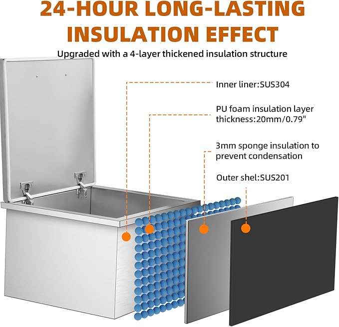 - Stainless Steel Construction: Made from high-quality food-grade 304 stainless steel, this ice chest is durable and easy to clean. The double-layer design and high-density insulating rubber interior keep your ice cool for extended periods.
