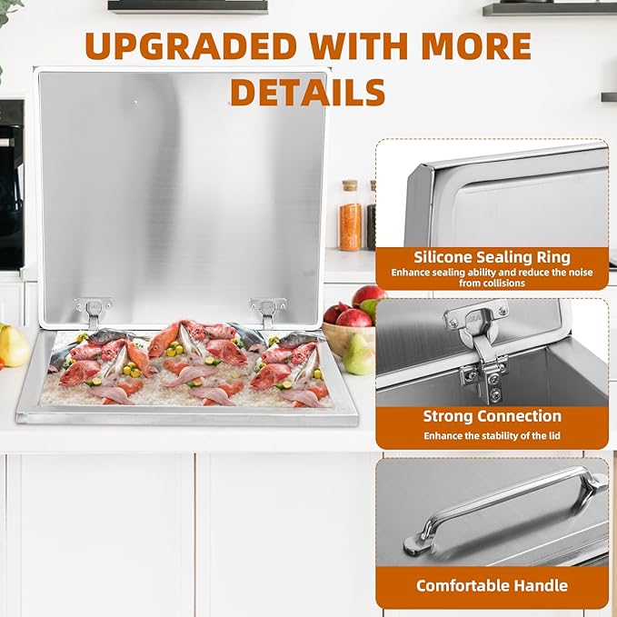 Upgraded Drop in Ice Chest, Stainless Steel Ice Cooler, Commercial Ice Bin with Cover, Outdoor Kitchen Ice Bar, Drain-Pipe and Drain Plug Included, for Cold Wine Beer