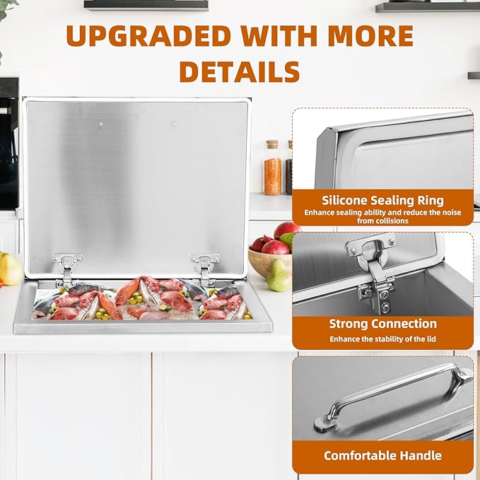- Spacious Design: With dimensions of 20''L x 16''W x 13''H, this drop-in ice chest fits snugly into small kitchen spaces. Its 46.7QT capacity is perfect for storing ice, beverages, or chilled foods for any occasion.