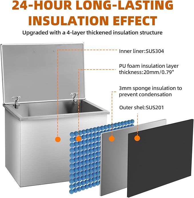- Stainless Steel Construction: Made from high-quality food-grade 304 stainless steel, this ice chest is durable and easy to clean. The double-layer design and high-density insulating rubber interior keep your ice cool for extended periods.