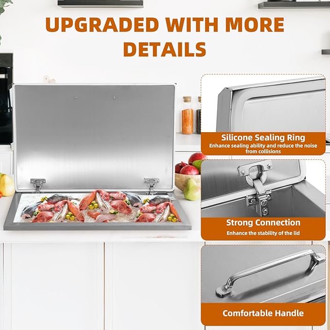 - Spacious Design: With dimensions of 27''L x 18''W x 21''H, this drop-in ice chest fits snugly into small kitchen spaces. Its 115.7QT capacity is perfect for storing ice, beverages, or chilled foods for any occasion.