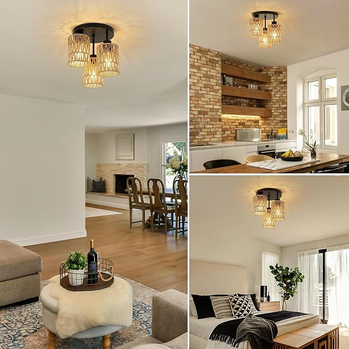 Boho Light Fixtures Ceiling Mount, 3-Light Boho Flush Mount Ceiling Light, Rattan Woven Chandelier Lighting for Farmhouse Bedroom Hallway Entryway Kitchen Nursery