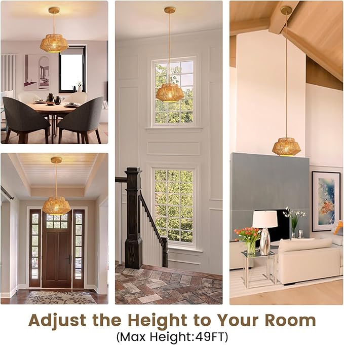 - Height Adjustable: The farmhouse chandelier ceiling light Width: is 10.1", Height: is 7.08", and you can adjust the hanging height of the rattan pendant light from 8.2" to 63.7" according to your preference and design. Available for flat or sloping ceilings. The modern chandelier can be compatible with dimmer switches and dimmable bulbs (the E26 bulb is NOT included)
