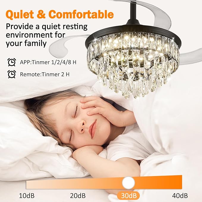 - 【Modern Crystal Fandelier】 Black fan light with built-in reversible DC motor brings you cool in summer and warm in winter.6 wind speeds to choose from, strong wind power and low noise. Provide a quiet sleeping environment for you and your family.